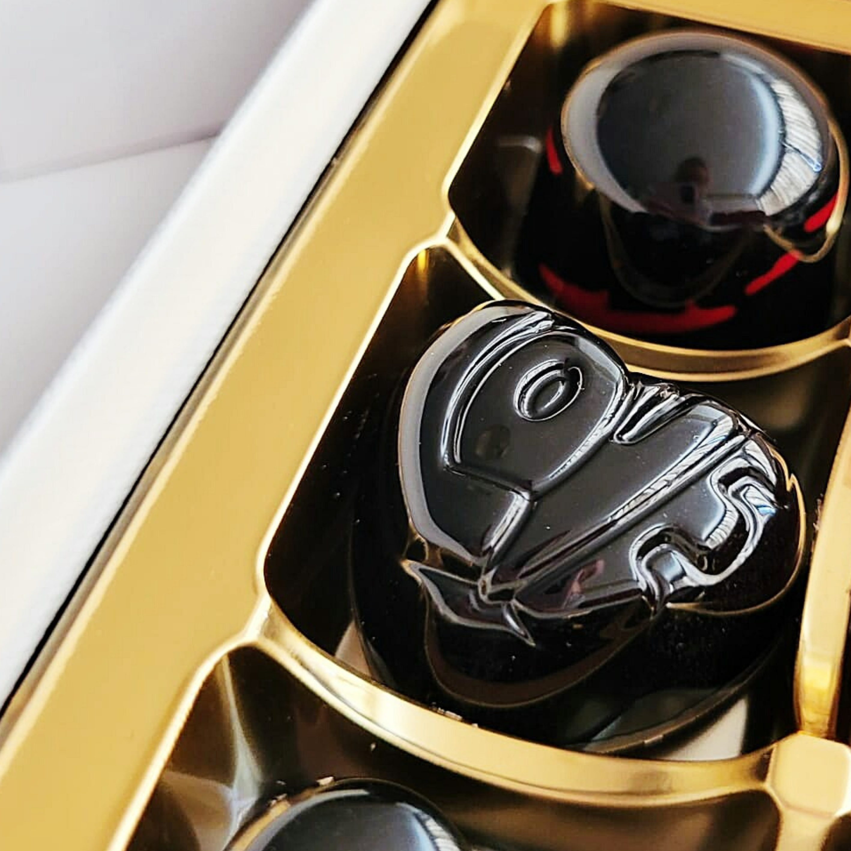 A whole 6 piece box of our edible art chocolates, celebrating anti-Valentine’s, each containing a gold foiled message card.